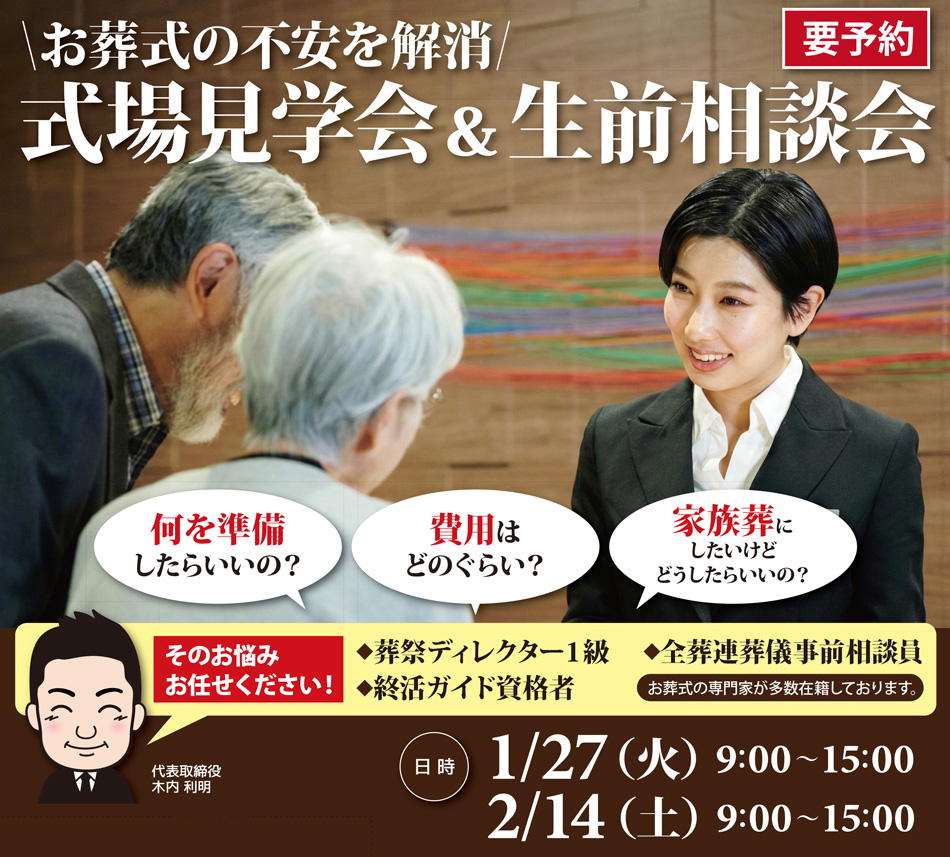 【1/27(火)・2/14(土)】お葬式の専門家が多数在籍!見学会&生前相談会開催。